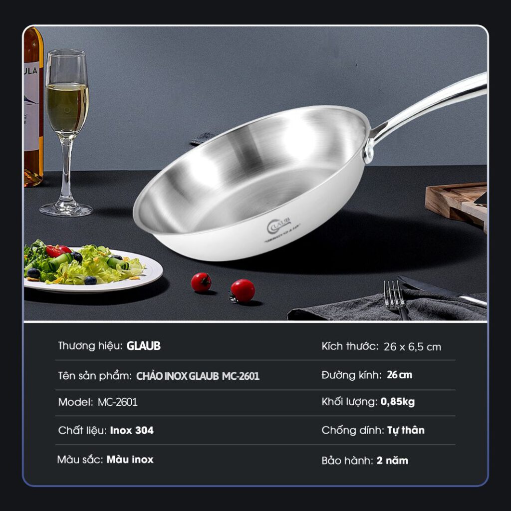 Chảo rán inox 3 lớp nguyên khối Glaub MC-2601 size 26cm