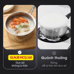 Đã bao giờ bạn đang say sưa nấu nướng thì canh/súp sôi trào ra bếp, khiến bạn phải lau dọn mệt mỏi? Với Glaub MCQ-160, nỗi lo đó sẽ tan biến! Sở hữu thiết kế đột phá với thành quánh cao tới 9,5 cm, Glaub MCQ-160 mang đến trải nghiệm nấu nướng an toàn và tiện lợi hơn bao giờ hết. Đây là “vệ sĩ” thông minh cho mọi món đun sôi, hoạt động như một lớp bảo vệ vững chắc, ngăn chặn tình trạng nước trào ra ngoài ngay cả khi sôi mạnh. Dù là nước dùng đậm đà hương vị, súp dinh dưỡng sánh đặc hay món hầm cần thời gian dài, Glaub MCQ-160 giữ cho bếp của bạn luôn sạch sẽ, gọn gàng, để bạn toàn tâm toàn ý sáng tạo.